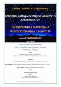 La comunità Laudato si’ di L’Aquila-Trasacco ha organizzato un pomeriggio di approfondimento su queste tematiche per il prossimo martedì 5 dicembre, presso l’auditorium Benedetto XVI dell’Istituto Superiore di Scienze Religiose “Fides et Ratio” di L’Aquila in via Vetoio, a partire dalle ore 17. Interverranno nel confronto: il dottor Gianluca Di Rico, Ricercatore presso l’INAF (Istituto Nazionale di Astrofisica); il sacerdote torinese Luca Peyron, Consigliere scientifico Humanae Technology Lab Università Cattolica; fra Piero Sirianni, Frate Minore Cappuccino, insegnante di Teologia Dogmatica presso l’Istituto di Scienze Religiose Aquilano e Giornalista Pubblicista. Modererà il confronto il dottor Daniele Imperiale, Consigliere dell’Ordine dei Giornalisti d’Abruzzo.