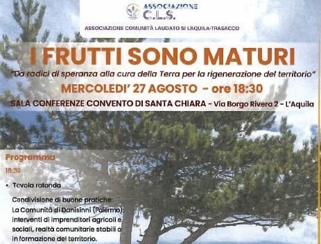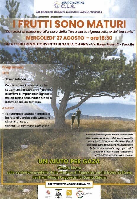 “I frutti sono maturi” è il titolo dell’evento che ci vedrà coinvolti mercoledì, 27 agosto, a partire dalle ore 18:30, presso l’aquilano convento “Santa Chiara” dei Frati Minori Cappuccini. “È tempo di raccogliere” i semi benedetti dalla Provvidenza! Dunque, scendiamo in campo, insieme, nella Città. E lo facciamo nel cuore dei festeggiamenti della nostra Perdonanza Celestiniana.