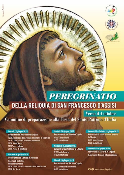 La Peregrinatio della reliquia di san Francesco è un importante evento che vivremo in terra d’Abruzzo, a partire dal prossimo 16 giugno. L’accoglienza e la venerazione di una parte del cappuccio del saio del Santo di Assisi e di una porzione delle sue ceneri visiteranno anche la nostra Chiesa aquilana dal 23 al 29 giugno, secondo il seguente calendario stabilito: lunedì 23, accoglienza della reliquia nella aquilana Basilica di San Bernardino da Siena; martedì 24, Monastero delle Clarisse in Paganica (AQ) e parrocchia di San Sisto; mercoledì 25, convento dei Cappuccini di santa Chiara a Borgo Rivera; giovedì 26, parrocchia di San Pio X; venerdì 27 e sabato 28, parrocchia di San Francesco a Pettino; domenica 29, congedo dalla chiesa di San Vito alla Rivera, con celebrazione della santa messa alle 11.