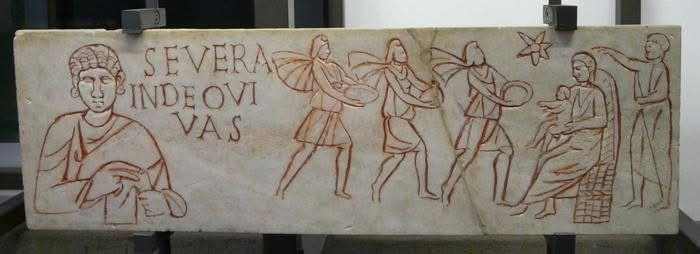Questa definizione aveva trovato una potente eco già nell’arte paleocristiana, come dimostra uno dei suoi capolavori più antichi: la lastra sepolcrale di Severa, proveniente dal cimitero di Priscilla sulla via Salaria, oggi ai Musei Vaticani. Databile tra la fine del III e l’inizio del IV secolo, la lastra — forse chiusura di un loculo infantile — reca l’augurio “Severa in Deo vivas” e una delle più antiche rappresentazioni dell’Adorazione dei Magi.