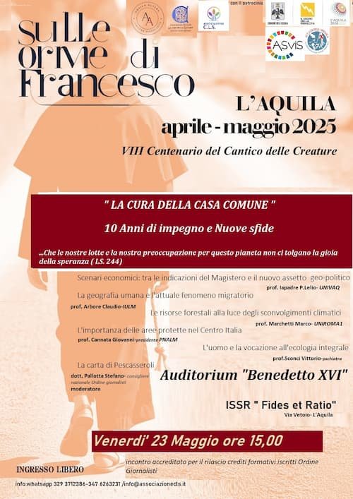 10 anni fa esatti papa Francesco consegnava alla Chiesa l’enciclica Laudato si’, dedicata alla cura della casa comune. Per tale evento, la comunità “Laudato si’ di L’Aquila-Trasacco” propone un pomeriggio di approfondimenti sugli scenari attuali della creazione e sulle sfide globali che ci attendono; con il coordinamento dell’ingegnere Salvatore Perinetti, referente della comunità “Laudato si’ L’Aquila-Trasacco” e la collaborazione dell’Ordine dei Giornalisti d’Abruzzo.